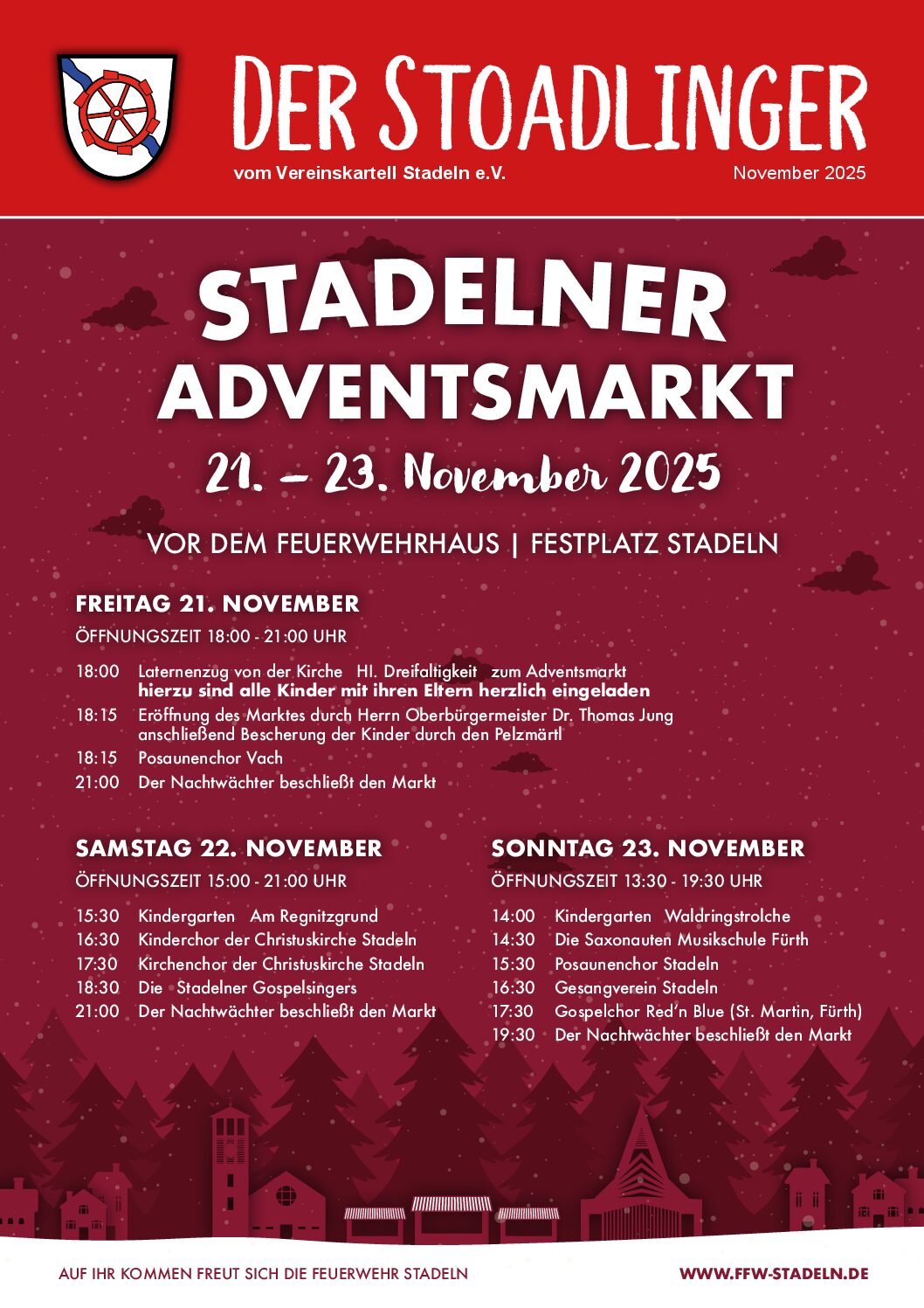 Der Stoadlinger ist die Vereinszeitschrift des Vereinskartell Stadeln. Dort informieren die Stadelner Vereine über Ihre Aktivitäten und Veranstaltungen. Der Stoadlinger wird an jeden Stadelner Haushalt verteilt. Alle Ausgaben des Stoadlingers finden Sie hier natürlich auch digital zum runterladen.